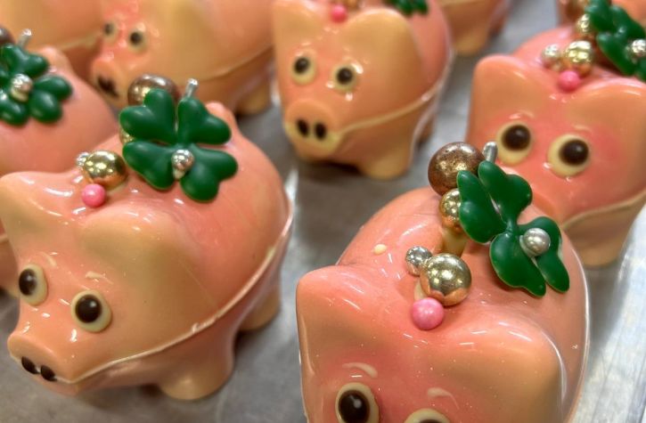 Zum Jahreswechsel hat unsere Confiserie wieder viele süsse Glücksbringer gezaubert: feine Schokoladen-Kleeblätter, kleine Champagnerflaschen aus Schokolade und weitere liebevolle Kreationen.